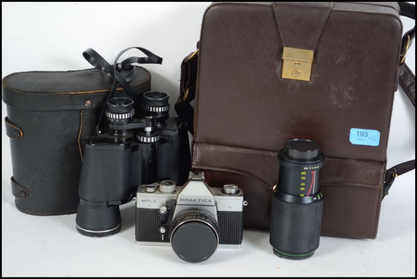 A cased vintage 35mm Practica camera and lenses together with a cased pair of binoculars.