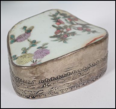 A four piece collection of Chinese blue and white ceramics to include two 19th Century high lipped plates along with a larger bowl, all with detailed character marks to base. The fourth piece being an unusual white metal box/pot with a hand painted ceramic hinged lid. Largest 27cms wide.