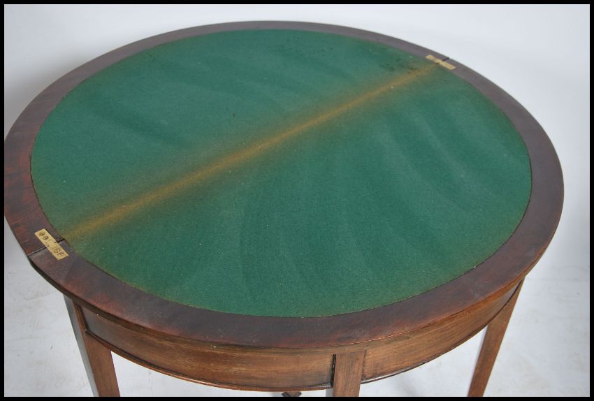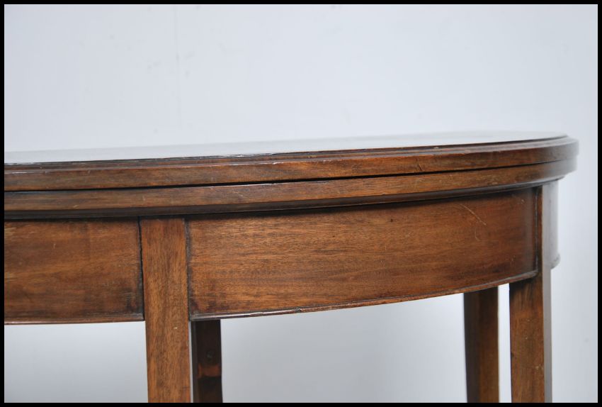 An Edwardian mahogany demi -lune card table being raised on square tapered legs with spade feet having flip over baize lined top. Measures:  75cms high x 86cms wide.