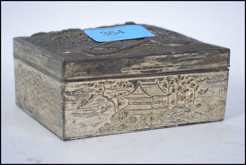 A vintage pressed metal Japanese / Chinese cigarette box having a Chinese calligraphy note dated to 1896 within. Please refer to images.