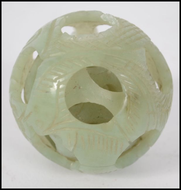 A 20th century Chinese Oriental jade three layer  carved puzzle ball. Measuring six cm diameter.