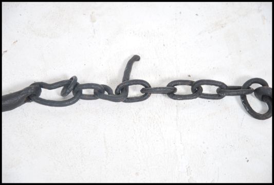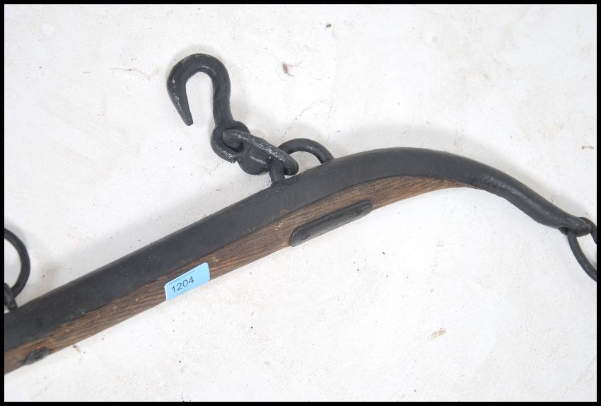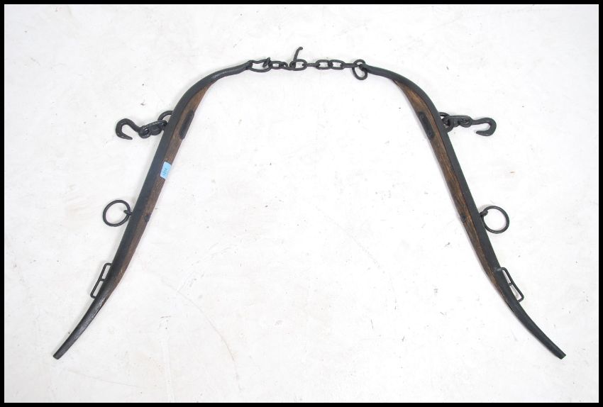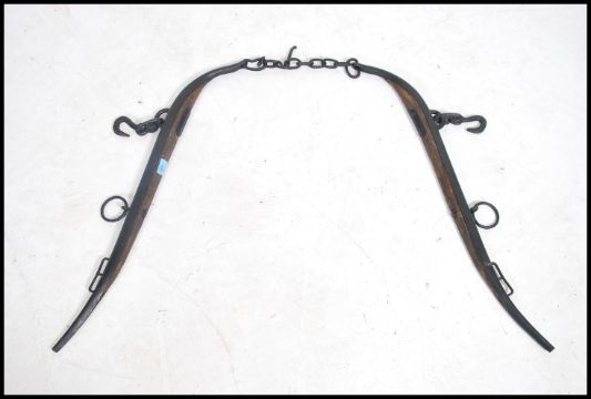 A pair of Victorian 19th century cast iron and oak agricultural horse hames complete with the chains