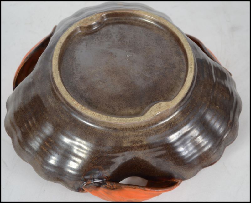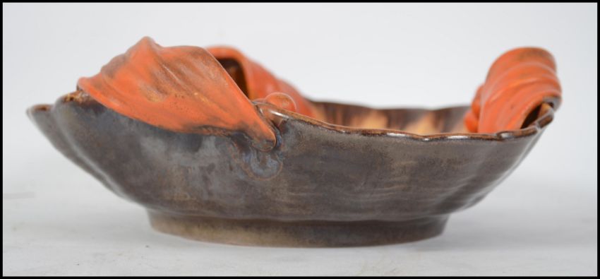 A stunning 1920's studio pottery dish of scalloped shell form with orange and brown form. Measures:  26cms wide.