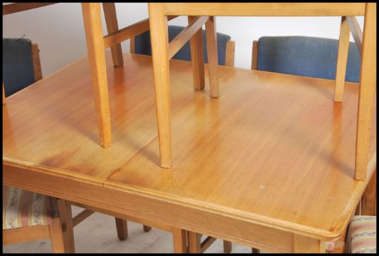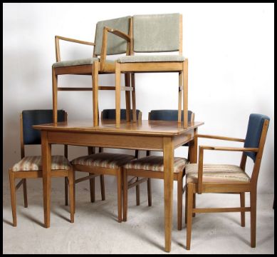 An original Gordon Russell walnut extending dining room table together with a set of 6 dining chairs by Gordon Russell. All items bearing Gordon Russell Broadway markings, The table complete with extra leaf and the chairs in good condition. Matching sideboard also available. Measures: 77cms high x 108cms wide x 78cms deep.
