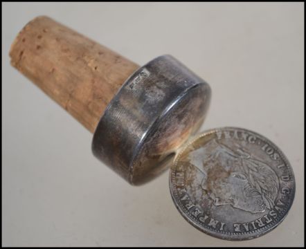 An Austrian silver hallmarked wine bottle cork stopper adorned with an Austrian silver coin for 1862 atop. Hallmarked with Hoopoe bird 935 and marked for maker AS. weight 27.2g