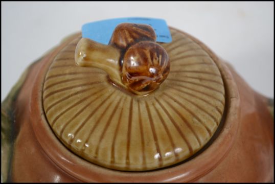 A 20th century Majolica teapot in the manner of George Jones having embellished glazed decoration complete with the lid. Unmarked to the base