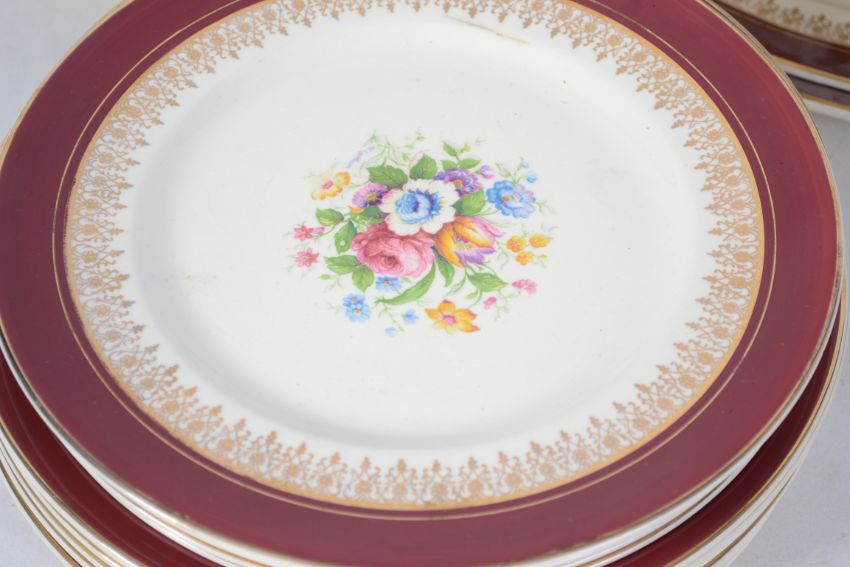 A mid century Myott ceramic dinner service comprising dinner plates, tureens etc. All marked to the base, the service with red banded borders with gilded finish