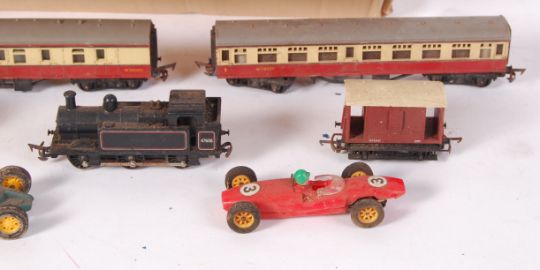 A collection of assorted Triang trains & track to include; carriages, various parts of train stations, straight & curved tracks, wagons etc. Also to include 2x Airfix controllers & 2x Scalextric cars. All loose.