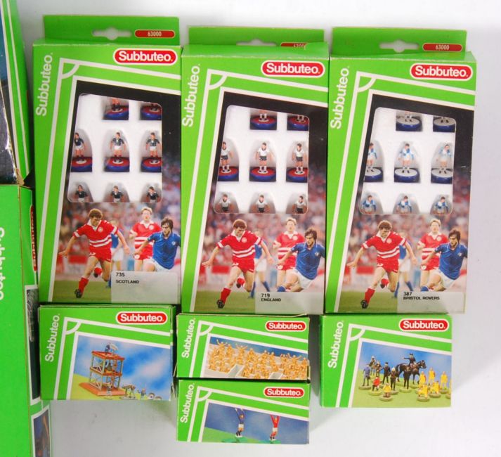 A collection of Subbuteo sets and football teams to include; England 719, Scotland 735 & Bristol Rovers 387. Also includes, a Subbuteo set, stadium lights, crowds, stadium staff, TV crew set etc. Contents unchecked, all within their original boxes.