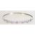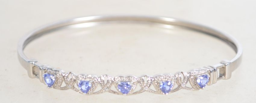 A sterling silver and CZ bangle bracelet having heart shaped blue stones with a ribbon swirls design. Marked 925 CZ.weighs 7.9 grams and measures 7.5 cms wide.