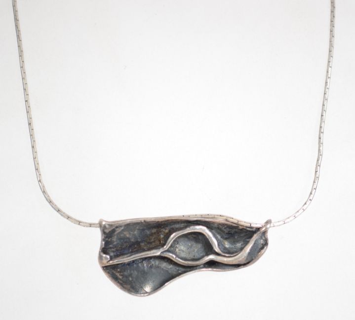 A sterling silver box link necklace chain with a bolt  ring clasp having a large dual bailed modernist pendant of unusual form. Weighs 28  grams and chain measures 16 inches and pendant is 6cms wide. Both pieces marked 925.