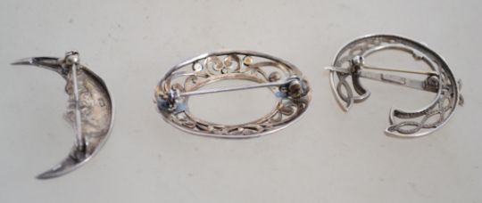 A group of three sterling silver brooches one of Celtic design, one having pierced scroll work and one being in the form of the moon with a face Total weight 14.1 grams and measure 4cms wide.