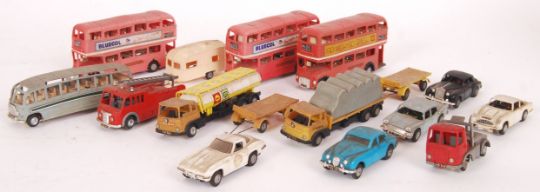 A collection of 14x original vintage Tri-ang Minic Motorway vehicles - 3x Routemaster buses, Jaguar, Fire Engine, Coach etc. Some with minor AF.
