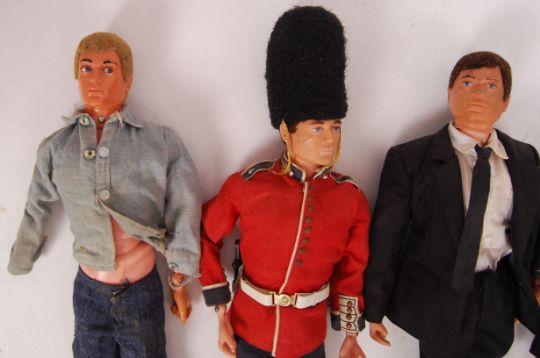 A collection of 5x GI Joe / Action Man figures by Palitoy / Hasbro. Each clothed, including one in a custom black and white suit. One Action Man with eagle eyes. All figures marked for Palitoy Under License by Hasbro 1964, and appear vintage.