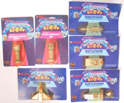 A collection of 6x vintage 1980's Gerry Anderson ' Terrahawks ' carded diecast and plastic models. All carded, unopened. Comprising of; Spacehawk, Battletank, Battlehawk, Terrahawk, Space Sergeant 101 and Sergeant Major Zero. Rare.