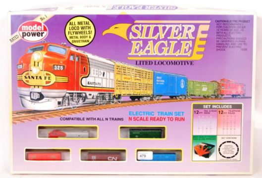 A Model Power N Gauge model railway train set 'Silver Eagle' 1150. Appearing to be complete and little used, within the original box. With locomotive and carriages (all boxed), track, controller and instructions. Within the original box.