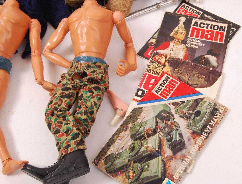 A large quantity of assorted vintage Action Man Palitoy uniforms, accessories, clothing etc. To include 3x Action Man figures (headless), figure paperwork, parachute, boots, weapons etc.