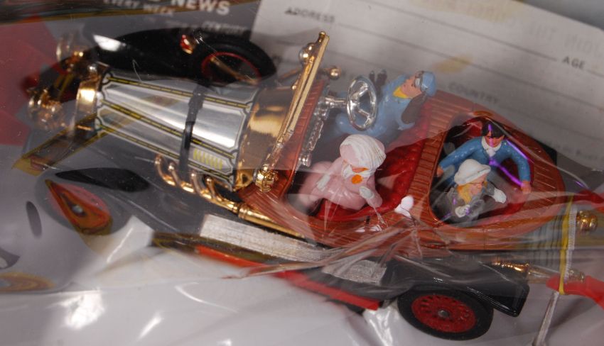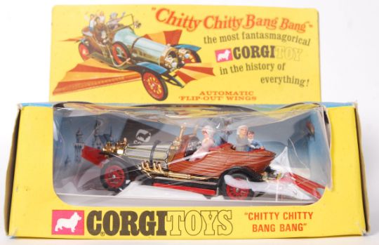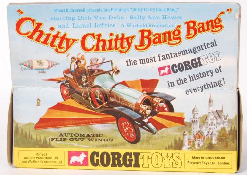 An original vintage Corgi Toys diecast model No. 266 Chitty Chitty Bang Bang. Appears to have been unremoved from the original box, still mounted to the plastic cloud base. Mint+ model, with all figures. Within the original box (slight crushing). Comes with the Corgi Club leaflet and also the original outer cardboard packaging slips.