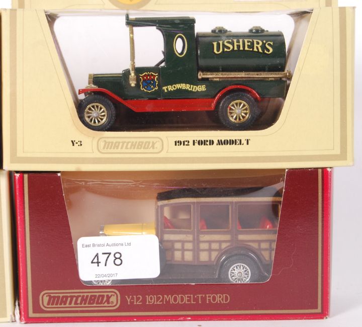 A collection of 4x original Code 3 (Custom) Matchbox Models Of Yesteryear; Y-12 Model T Ford 24/450, Y-3 Ford T Usher's Of Trowbridge 6/25, Y-12 Model T J.Arkell & Sons, and Y22 1930's Ford Model A van with Wiltshire Times livery (with certificate). All mint, unused, in original boxes.