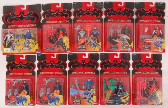 A collection of 10x Batman & Robin Kenner made carded action figures. All sealed / unopened / unused. Including a Batman & Bane double figure set (bubble lifting). Otherwise all appear mint.