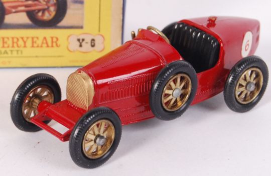 An original rare variation Matchbox Models Of Yesteryear Lesney Y-6 1926 Bugatti Type 35. Red body, No. 6 decal with rare gold radiator variation. Within the original box.