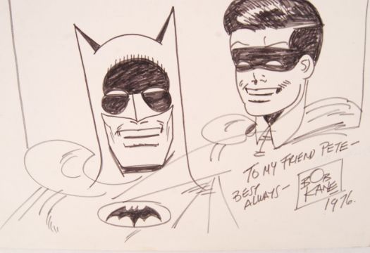 A fabulous original sketch of Batman & Robin by co-creator and cartoonist Bob Kane. Featuring a head and shoulders double pose of the Dynamic Duo, Kane has dedicated the sketch to 'My Friend Pete - Best Always ,' and has added the date of 1976. A good period sketch. Drawn in black marker to artists board. Size; 28cm x 35cm. Accompanied by a letter of authenticity by 'Pete' who goes into great detail as to how he came to own the sketch when helping Bob Kane in a lawsuit. Kane gave the sketch to Pete and his then girlfriend Linda. When the couple split, 'Pete' erased her name from the sketch. Good provenance, and an interesting period sketch. Rare.