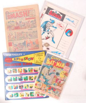A collection of vintage Batman items to include; a very early gumball type machine Batman penny metal fronted watch with cardboard Batman insert, a vintage Batman school-book artwork cover (unused) a September 1967 SMASH! comic book with Batman, a ' Giant Batman Album' No.5 and a set of Chad Valley Give-A-Show projector slides in their original display pocket.