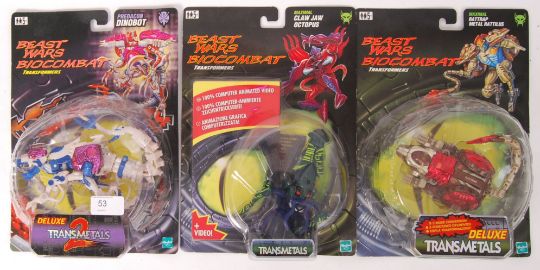 A collection of 3x original Hasbro Beast Wars Biocombat Transformers carded Transmetals action figures to include; Claw Jaw Octopus with video, Dinobot, & Rattrap Metal Rattilus.