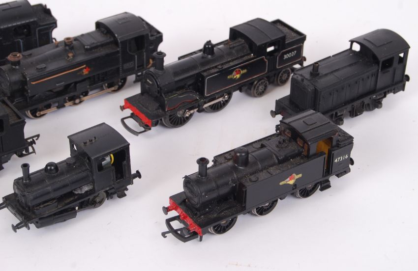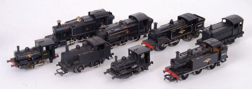 A collection of 8x 00 gauge railway trainset locomotives - all unboxed - all in black livery, comprising of: 51212 kit loco, another similar in plastic by Hornby, Triang black loco, 30027 Triang, Graham Farish 9410, Lima 5557, unnamed black tank locomotive, and Hornby 4716. All unboxed. Note: From a large private collection of 00 gauge locomotives and rolling stock. Boxed items are generally mint unused or lightly used. Loose locomotives are generally used but very good (and generally all in working order). An impressive private collection. Buyers are reminded to satisfy themselves as to condition of individual items prior to bidding as condition of some, will vary.