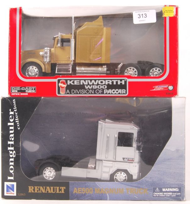 Two 1:32 scale precision diecast model truck cabs. Power Speed model Kenworth W900 Paccar and a NewRay Renault AE500 Magnum Truck. Both appear mint, within original boxes.