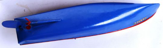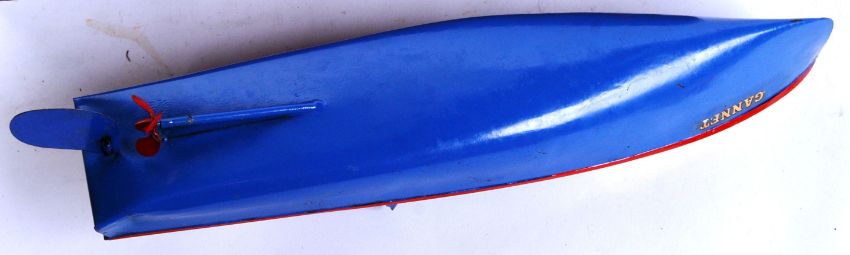 A rare c1930's Hornby Meccano made tinplate clockwork Speed Boat No. 3 ' Gannet '. Blue hull and white decking. Within the original box, complete with key and paperwork. The box retaining its full original pictorial label, and the correct colour code dot label to the side. Working order.