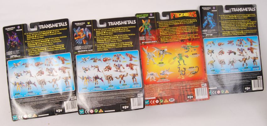 A collection of 4x original Hasbro Transmetals & Fuzors Beast Wars Biocombat Transformers carded figures to include; Maximal Airzor/ Metal Falcon, Predacon Terrorsaur, Predacon Spittor & Predacon Sky Shadow Locusta.