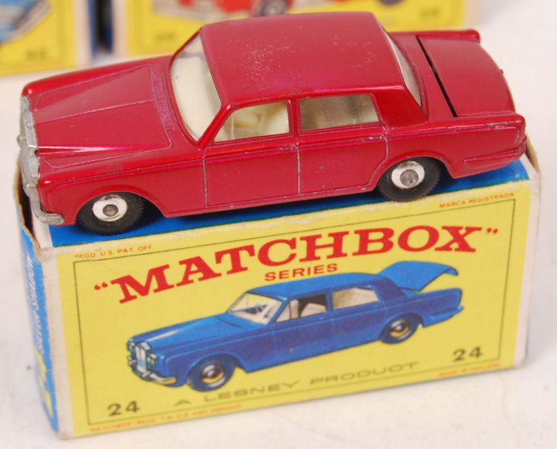 A collection of 6x vintage Matchbox Lesney diecast models, comprising of; 29 Fire Pumper, 42 Studebaker, 12 Safari Land Rover, 75 Ferrari, 24 Rolls Royce and 33 Ford Zephyr. All with original boxes.