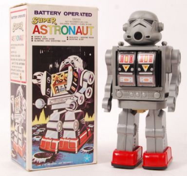 A vintage Japanese battery operated toy robot. Made by HK. Likely 1970's, clearly inspired by a Star Wars Stormtrooper. Within the original box. Appears mint, likely unused. 29cm tall.