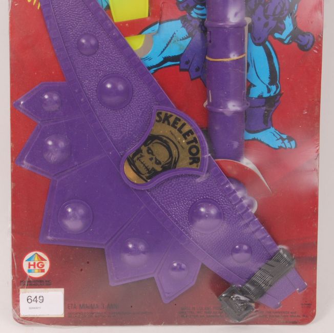 A rare Masters Of The Universe 1980's ' Skeletor Weapons Set ' with 'Glo-In-Dark' features. Factory sealed, within it's original wrapping, unused and mint. Made by HG Toys under license by Mattel. Italian. Rare.