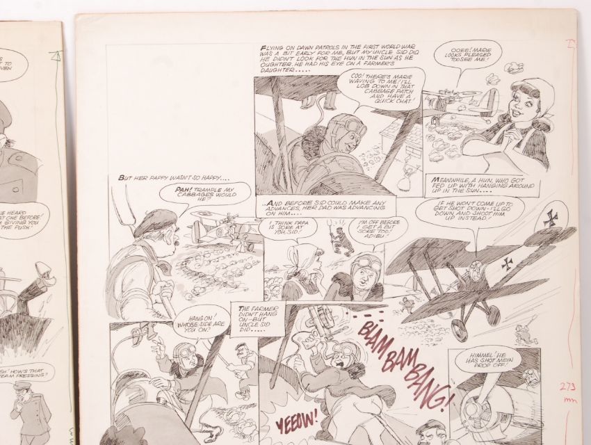 Two panels of original Look-In Annual artwork depicting two panels from a different comic strips 'What Hugh Said Was True' and 'Uncle Sid'. Both watercolour and ink. Each panel annotated with notes as to size and location of artwork. Rare. Each; 46x35cm.