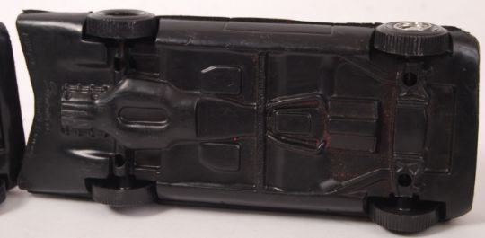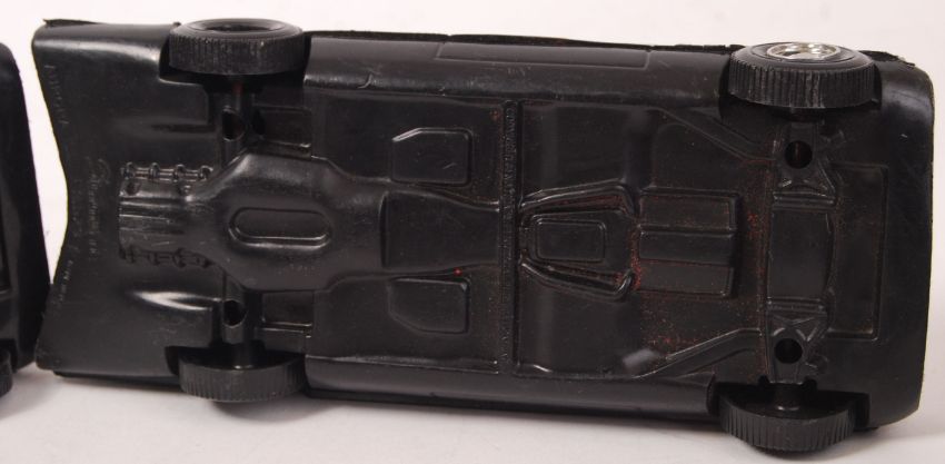 Two vintage plastic toy Batman Batmobiles. One made by Simms, the other by Duncan. The Simms variation with Batman and Robin plastic figures present. 21cm long.