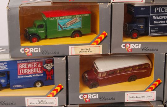 A collection of 18x Corgi diecast model Corgi Classics. All advertising / haulier interest. All Bedfords (and 1x Limited Edition Ford Model T). Including coaches, buses, trucks etc. All appear mint, within the original boxes.