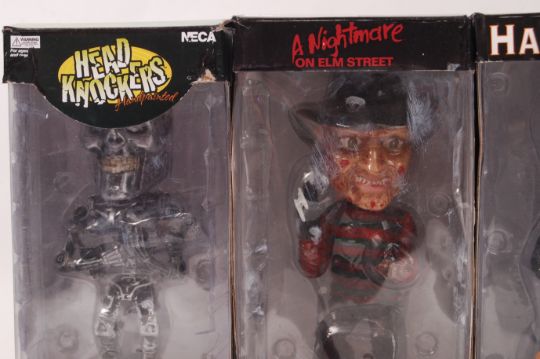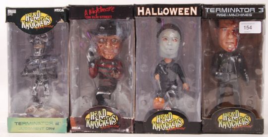 A collection of 4x Film / Horror related NECA made Head Knocker action figuers. All unused, within the original boxes. To include; Terminator 3, Halloween, Nightmare On Elm Street and Terminator 2. All boxed.