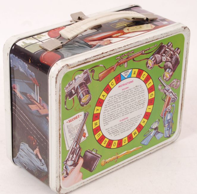 A rare vintage 1960's ' Secret Agent ' made tin metal lunch box, with plastic carry handle. Each side with litho-printed tin pictorials. Made in 1968 by King Seeley Thermos Co.
