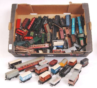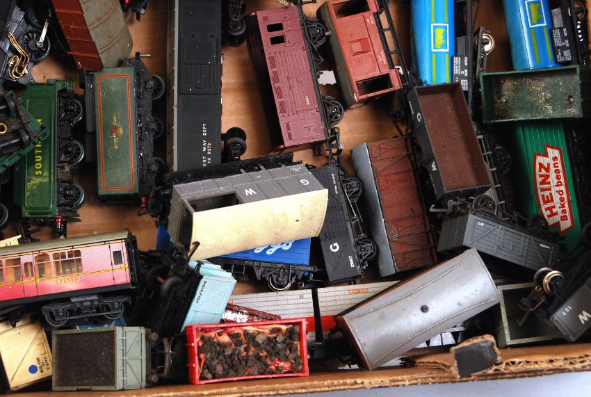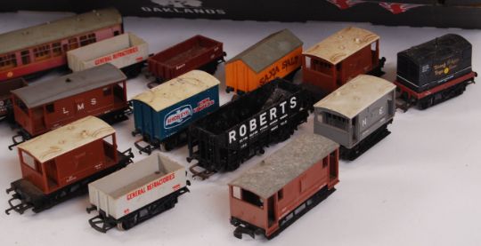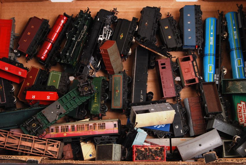 A large collection (likely 50+) 00 gauge rolling stock and related pieces. Mostly Hornby, but some Triang Hornby, Airfix, Lima etc. To include carriages, wagons, trailers, Milk tankers, various tenders, Roberts, Heinz, Triang Toys advertising wagon and many others. All unboxed.