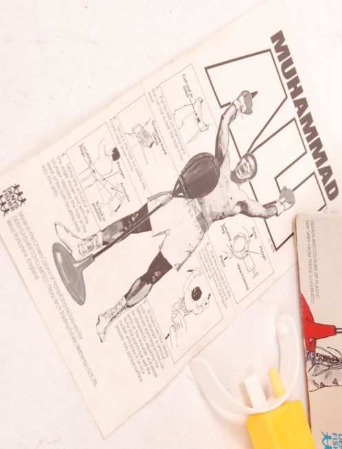 A rare Mego made Muhammad Ali action figure. Complete with original instructions, punch ball and boots. The figure retains the inner white card slip and paperwork. Within the original UK issue Denys Fisher white box. Condition appears mint / unused. Rare