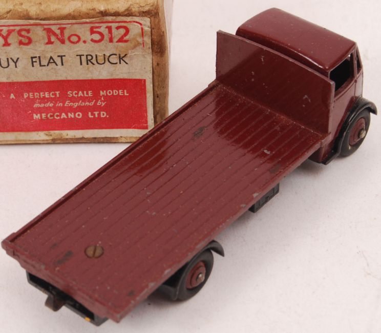 An original Dinky Supertoys diecast model 512 Guy Flat Truck. Within the original box. Maroon, with silver grille and black chassis.