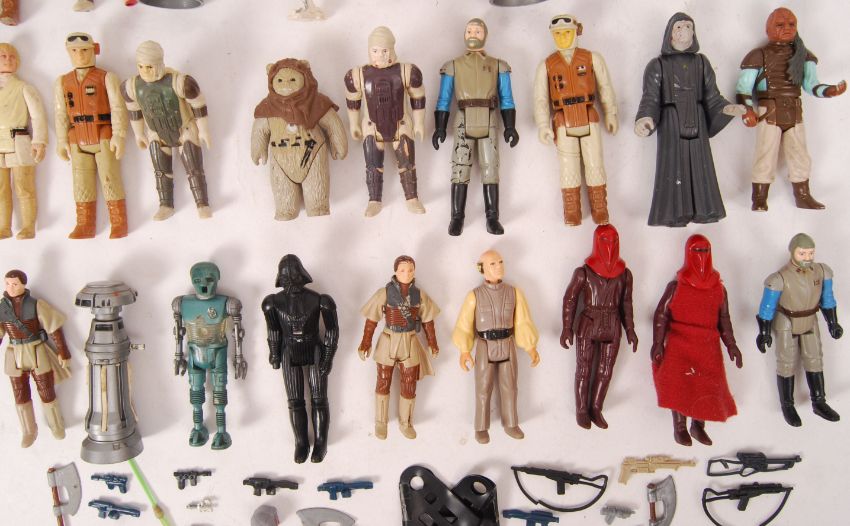 A collection of 33x vintage Star Wars action figures to include Darth Vader, Luke Skywalker, Ewoks, droids, etc. Some duplicates. Also included are a collection of accessories / weapons.