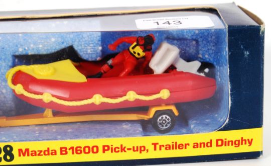 An original vintage diecast model Corgi Gift Set 28 ' Mazda B1600 Pick-Up, Trailer and Dinghy .' From an ex-shop-stock collection. Contents mint / unused, within a very good to near mint original box. Complete.