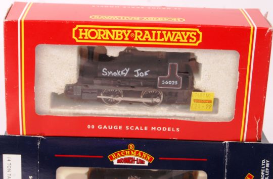 A collection of 3x 00 gauge railway trainset locomotives. 2x Hornby: R782 Smokey Joe and R2095A Top Link 1421. Along with a Bachmann 16023 locomotive, with box.