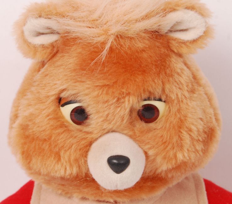 A rare vintage Worlds Of Wonder / Playskool made ' Teddy Ruxpin ' talking cassette battery powered teddy bear. Working order, with an 'Airship' cassette. c1985. 43cm tall.