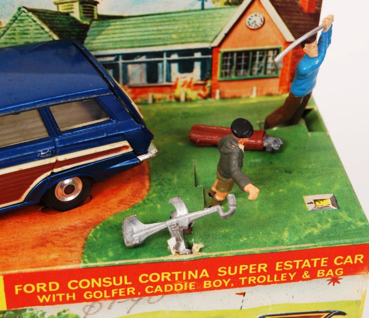 An original vintage Corgi Toys diecast model No. 440 Ford Consul Cortina Super Estate Car. Model appears very good to near mint, within a mint original box, and mint display stand. Figures also appear mint. 100% complete, with figures, trolley and golf club bag.