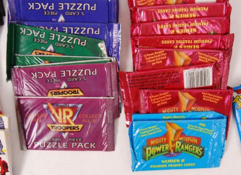 A large and good assortment of assorted Bubble Gum and Trading cards. All in sealed packs, mostly vintage. Comprising of; 1989 Topps ' New Kids On The Block ' (x10 packs), 1990 Teenage Mutant Ninja Turtles 2nd Series (x10 packs), VR Troopers (x20 packs), Mighty Morphin' Power Rangers (x10 packs), and Mighty Morphin' Power Rangers The Movie (x10 packs). All sealed. Along with an incomplete set of Marvel Comics ' Super Heroes Card Game ' cards - loose.