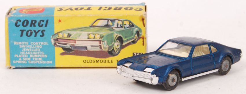 A vintage Corgi Toys diecast model No. 264 Oldsmobile Toronado. Blue. Near mint, within the original box (box with a replacement flap).